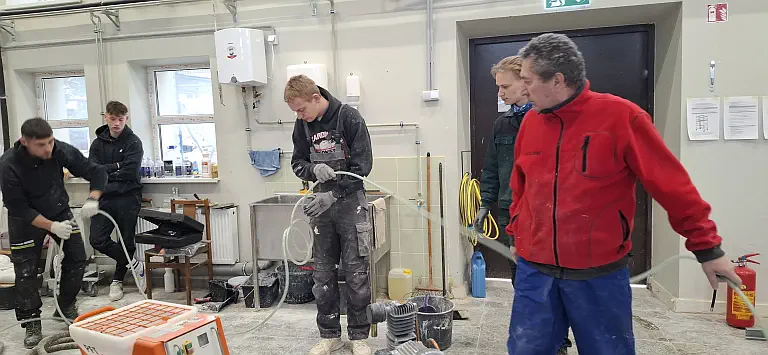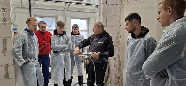 Čia vyko intensyvios praktinės pamokos „Statinio paviršių glaistymas ir dažymas mechanizuotu būdu“.